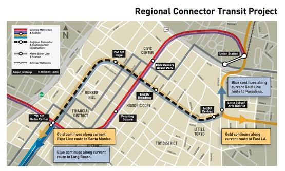 The Metro Regional Connector Project extends from the Metro Gold Line Little Tokyo/Arts District Station to the 7th Street/Metro Center Station in downtown Los Angeles, allowing passengers to transfer to Blue, Expo, Red and Purple Lines, bypassing Union Station. The 1.9-mile alignment will serve Little Tokyo, the Arts District, Civic Center, The Historic Core, Broadway, Grand Av, Bunker Hill, Flower St and the Financial District.