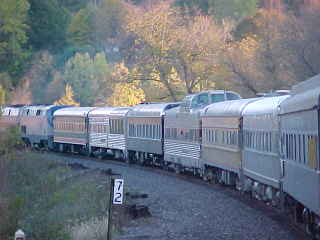 We had Eggs Benedict with homemade applesauce and pomegranate this morning. I've laid off eggs pretty well, but on this trip I'm bending the rules a little bit. Coming through this part of the county, Ohio, Maryland, Pensylvania, is just exquisite. The foliage is a rainbow of colors and never seems to run out of them. Many railfans out in the fields, along the railtracks and in the towns, wave and smile as we go. Sometimes we're going fast and sometimes we're going slow, but these people brave rain, wind and snow to take their historic pictures and greet the passengers as they glide gleefully by. Hopefully, many of them will be onboard someday soon so they too can wave to other railfans as they speed along the rails. I think that the "rush" is a lot stronger on "this side of the fence."